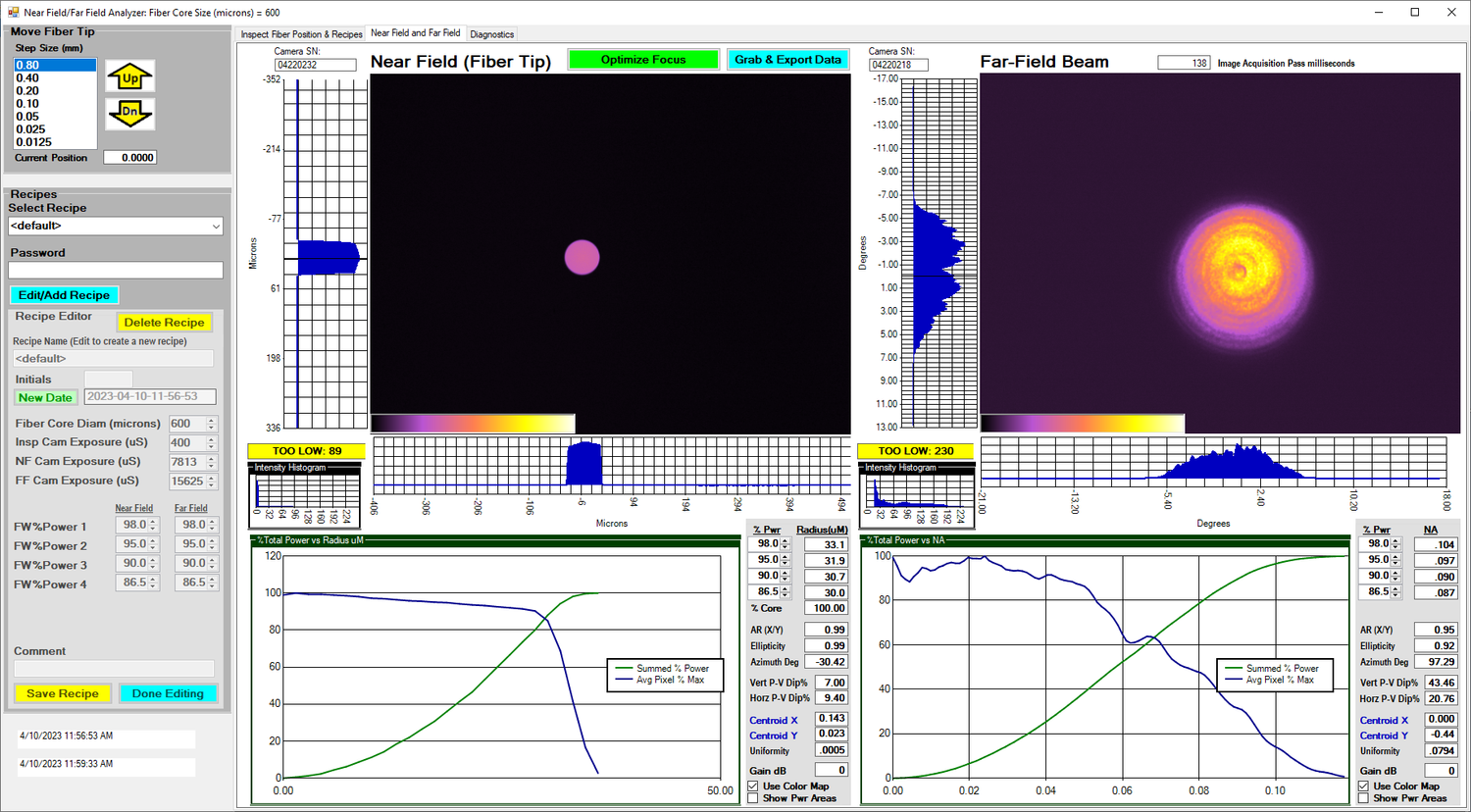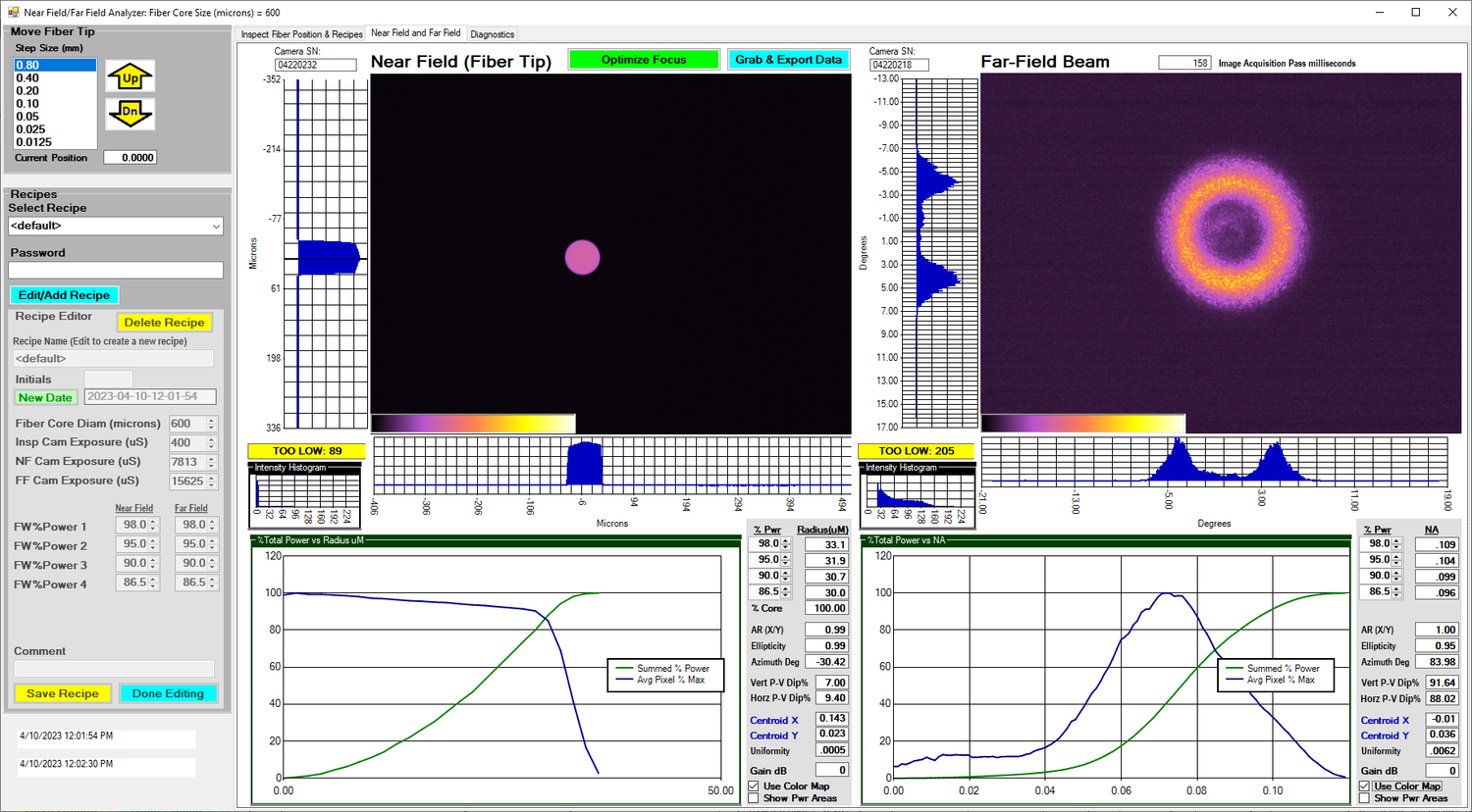 Continuously captures and analyzes both the near-field and far-field images for small (<1mm diameter) diverging sources such as fiber coupled lasers, single emitters, and TO-Cans.
